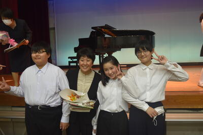記念撮影会もほどほどに終了した頃、これまでピアノを担当していただいたピアノ講師の先生に感謝の気持ちをこめて花束を贈呈しました。