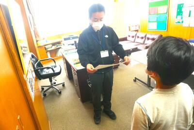今回もオンラインでの開催となり、代表児童が校長室にて各賞の賞状を受け取りました。