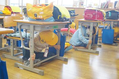 雨の中での開催ということで、防災頭巾の使用や校庭への避難はありませんでしたが、緊急地震速報の放送とともに、すばやく机の下へ隠れて揺れに対応することが出来ました。