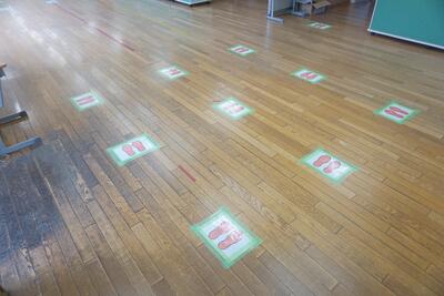 今回、室内での引き取りに際し、保護者の皆様が出来るだけ密集しないように、引き取りを待つ際の目印を用意し、ソーシャルディスタンスを保って安全かつ、スムーズに引き取りができるように対応しました。