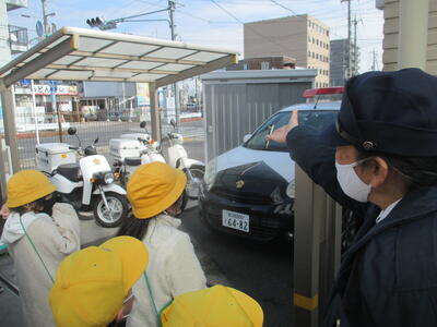 本日、3年生が社会科「安全な春日部市に」の学習の一環で、交番見学を行いました。