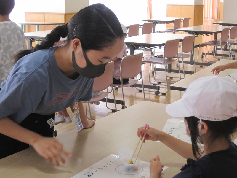 下の写真は、給食委員会の児童が2年生にはしの練習をしてくれている様子です。