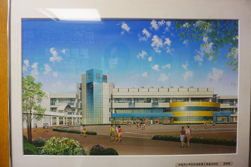 校長室に飾ってある竣工前に描かれた武里西小の完成イメージ図です。