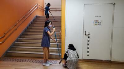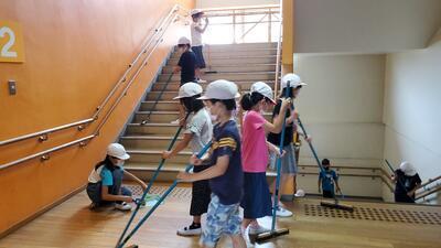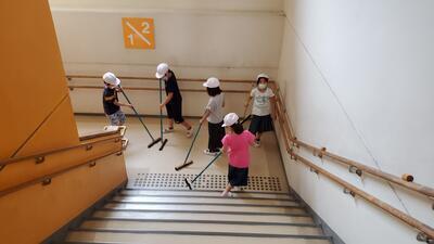 歴代の武西っ子は、「自分たちの学校は、自分たちで綺麗にしよう」と、普段の掃除では綺麗にしきれない場所、特に埃が溜まりやすい階段の掃除をボランティアで行っています。