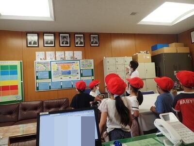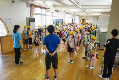 ある晴れた日。1年生は、学校探検でプールや校長室などを見てまわりました。