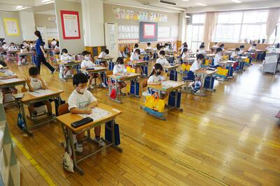 初めての算数のテストです。オープンスペースまで机と机の間隔を広げるのも初めて。