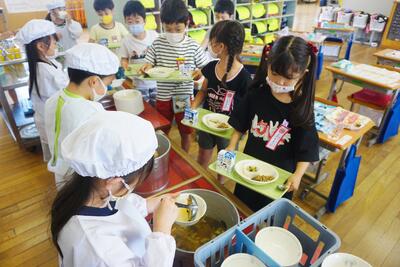 給食当番になった子供たちは、先生たちから食材の盛り付け方、お皿やおわんの置き方などを教えてもらい、緊張しながら行っていきました。