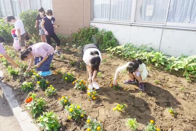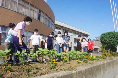 緑化委員会では、学校花壇に咲いている花の種類を教えてもらい、実際に草むしりを行いました。