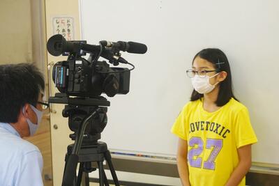 朝の登校風景や6年生の授業の様子を撮影し、6年生3名の女子児童へのインタビューも行われました。