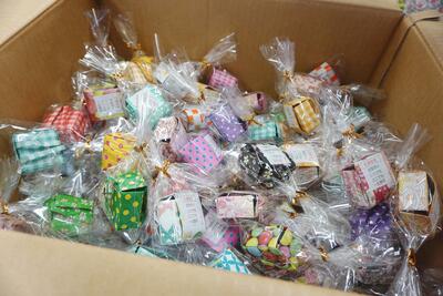 段ボールいっぱいに詰められたカラフルな手作りミニランドセル。