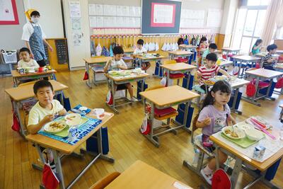 給食の時間でも、コロナウイルス新型感染防止の対策がとられています。