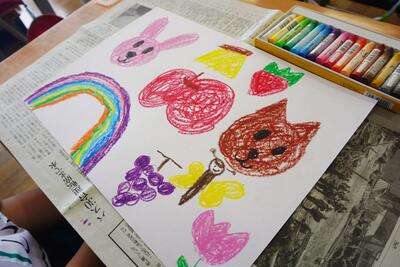 犬やうさぎ、ちょうにりんごに虹など可愛らしく、色も丁寧に塗っていますね。