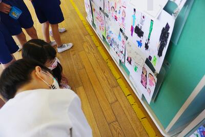 早速、作品が掲示されると、「あっ!ぼくのがある!」とか「〇〇さんの絵、うまいな!」「〇〇さんのこれ、わたしも好き!」などお友達の作品を見比べながら、盛り上がっていました。