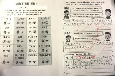 昨年度に引き続き、埼玉県教育委員会が発刊している「人権感覚プログラム(学校教育編)」第2集の中に収録されている「当たり前ってどいうこと?~仕事を性別から考える~」というテーマを基にして、職業には男女の垣根はなく、どの職業だって誰でも就くことができることを考えていきました。