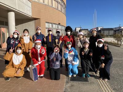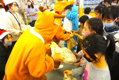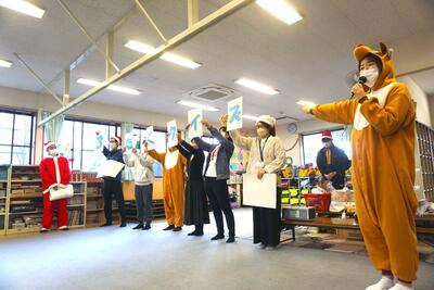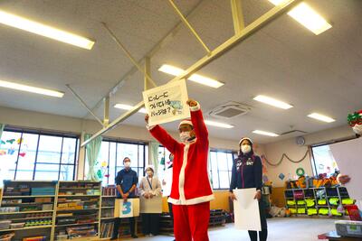 児童クラブでは、恒例のクリスマス会が行われ、そこにサプライズゲストとして、たけにしサンタと愉快な仲間たちが登場しました。