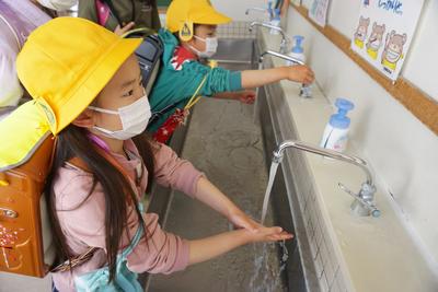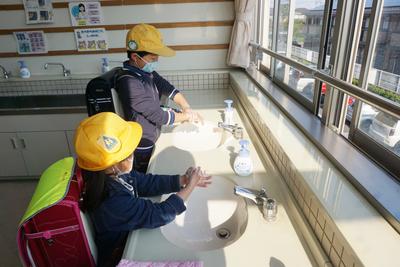 新型感染拡大防止のため、登校後は教室に入る前に手洗いを行いました。
