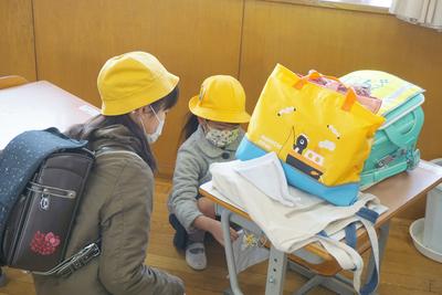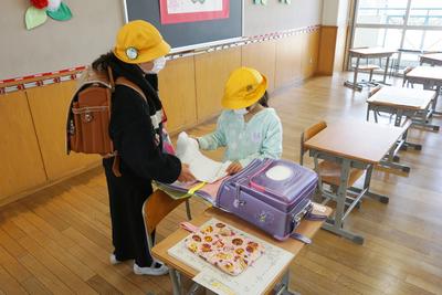 登校班のお兄さんやお姉さんに席の場所や荷物の片付けなどを教えてもらいながら、全員が揃うまで静かに席で待つことができました。