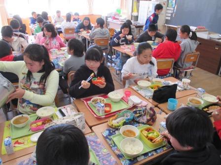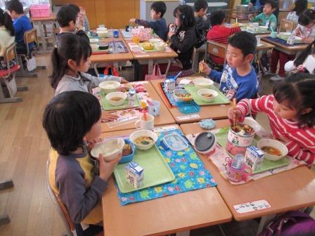 給食室でご飯、牛乳、みそ汁を用意していただき、