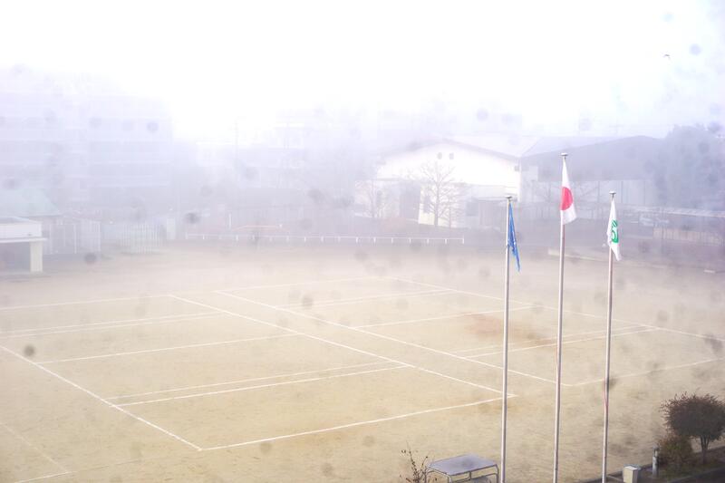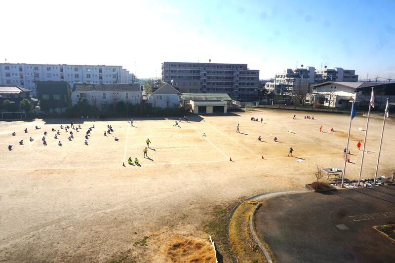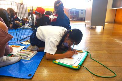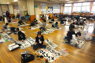 他校では、学年で書きぞめを行う際には体育館で行うことの多い書きぞめですが、武里西小では校舎の特色を活用しています。
