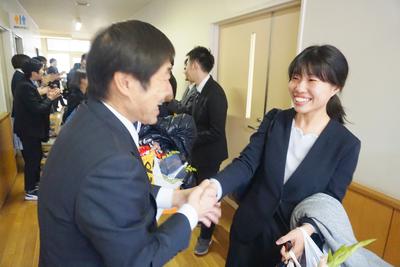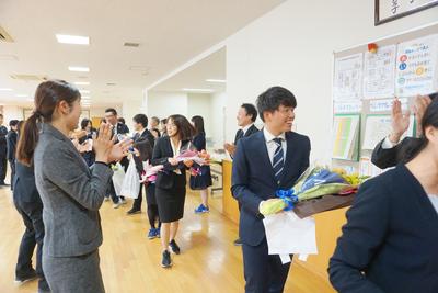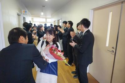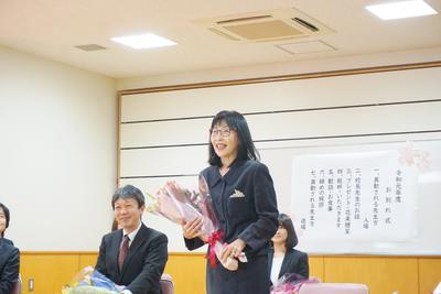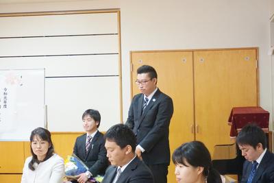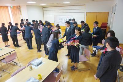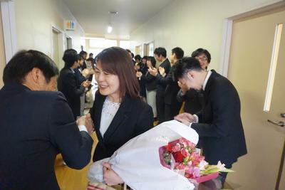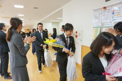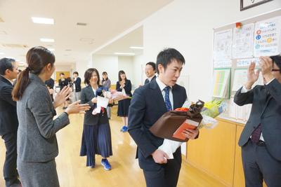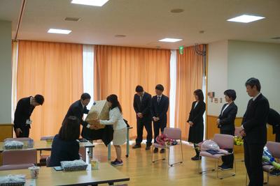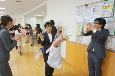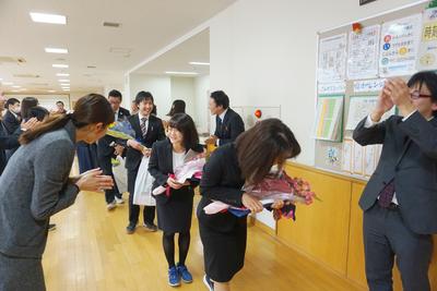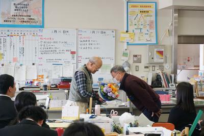 26・27日とJTEの山崎先生と校務員の古田さんの御勤務が最終日となり、職員から花束が贈呈されました。