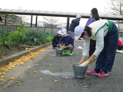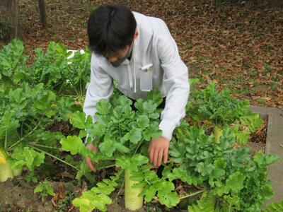 本日、その大根を5・6年の代表児童が収穫し、給食の調理員さんに手渡しました。