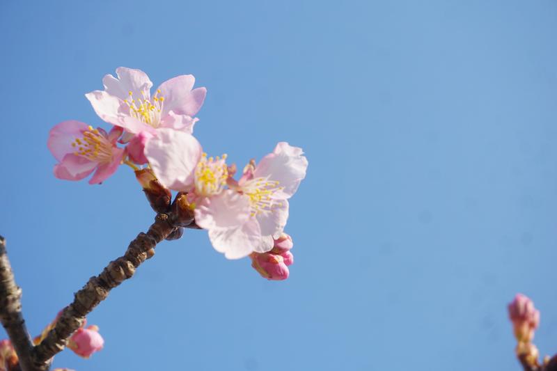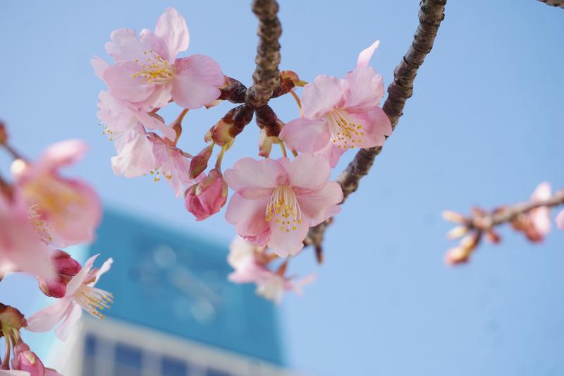 このところの暖かい陽気で、武里西小の河津桜もすっかり花開き。