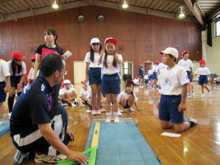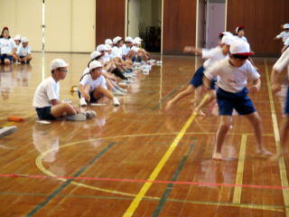 | 今週は、体力テスト週間です。毎日どこかの学年が校庭や体育館でテストを行っています。先日の児童集会・運動委員会の発表では、体力テストで記録を伸ばすポイントの説明がありました。1秒でも1㎝でも記録を良くしようと頑張っています。 1・2年生は、5・6年生お兄さんやお姉さんに補助をしてもらって、テストを受けています。とても仲良く微笑ましい光景でした。 | |