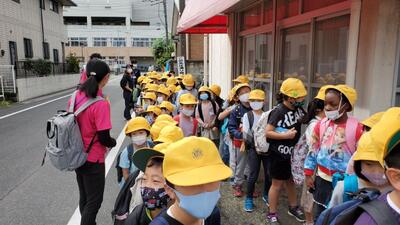 四年生が越谷市立児童館コスモスに向けて出発しました。