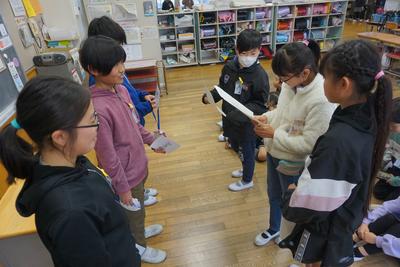 事前に交流の仕方をまとめたプリントを参考にしながら「質問ありますか?」など、算数科での交流の仕方で、よりよい自己表現を模索し、違った考えから共通することを見つけ、考えを深めていきました。