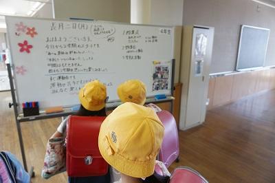 オープンスペースや教室に行くと先生たちからのメッセージを読む子供たち。