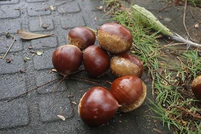 安全確認後、強風で葉が散らかった中庭では先生たちによる栗拾い。