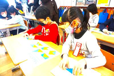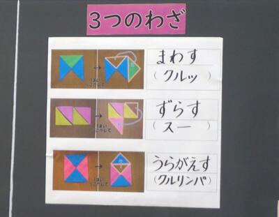 今回の授業では、「回す→クルッ」「ずらす→スー」「裏返す→クルリンパ」という3つの技を使って、形を変えていきました。