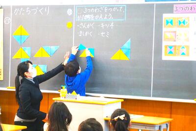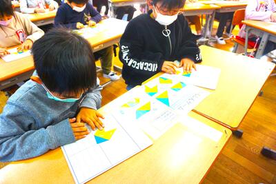 今回の授業では、色板の形に着目し、色板を並べたり動かしたりしながらいろいろな形を作る活動を通して、形を構成・分解することを考え、説明するのが目標になります。