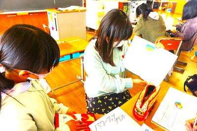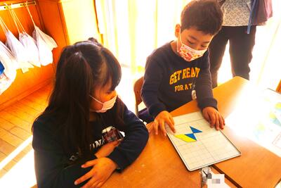 まずは自分で考えてやってみて、ペアの子に見てもらい、考えを共有しました。