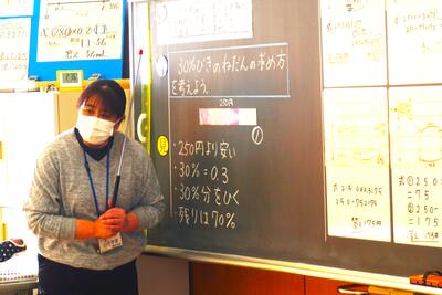 買い物の際によく目にする「〇〇%引き」という言葉が登場し、割引後の値段を求めていく問題だということを確認し、問題に取り組んでいきます。