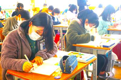 また、令和3年度 市内書きぞめ展覧会(オンライン)が本日まで開催され、校内書きぞめ展において特選を受賞した作品の中から代表の1点が掲載されました。