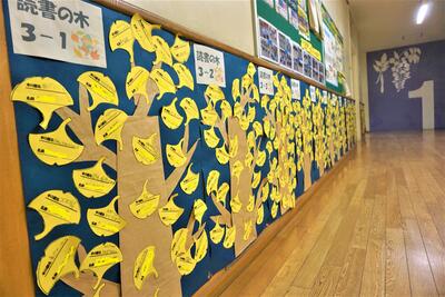 世間では、色とりどりの紅葉の景色も落ち着き、落ち葉の絨毯が冬の景色へと誘ってくれていますが、武西の校内では、各学級の読書の木が職員室前の廊下に飾られ、見頃を迎えています。