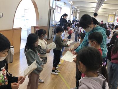 今日の朝の活動で、2年生が1年生に招待状を渡しました。