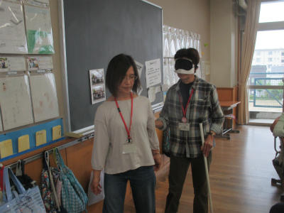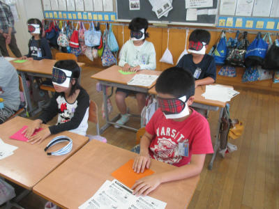 さて、そんな中、地域の方やボランティアの方々を御招きし、4年生がアイマスク体験を行いました。