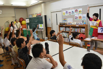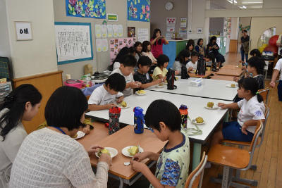 4・5・6組では、体力向上のために行っている毎日の運動や、学年園から収穫したジャガイモを使った食べ物を栄養教諭の楽しい食育クイズとともに味わったり、音楽の先生と一緒にリズムにのって体を動かしたりしました。保護者の方にも参加していただいて、子供たちも楽しそうな笑顔。