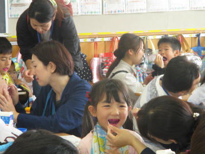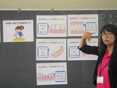 1年生は、保護者の皆様に御手伝いいただきながら、歯磨きのカラーテストを行い、正しい歯磨きの仕方などについて学びました。