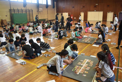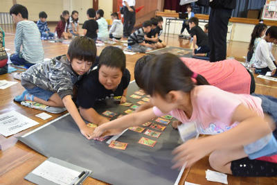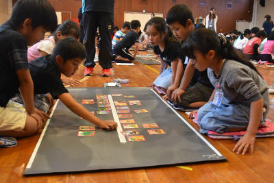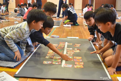 昨日のサッカーワールドカップの日本代表の選手のように集中して、札と向き合っている3年生。はじめての郷土かるたでしたが、楽しく取り組むことができたようです。