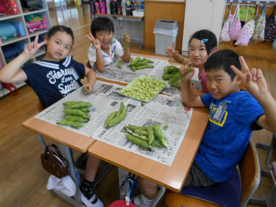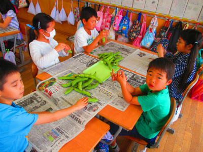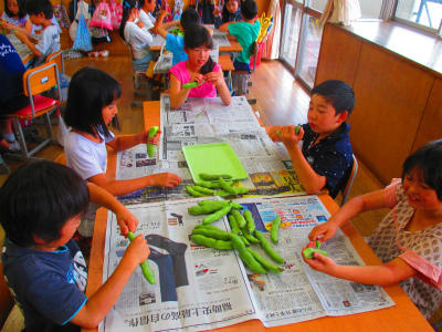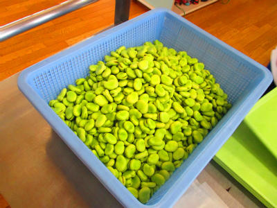 | | | 昨日の給食のメニューそら豆は、3年生がむきました。そら豆は空に向かってさやが伸びるからその名前がついたこともおそわりました。給食でおいしく頂きました。 |