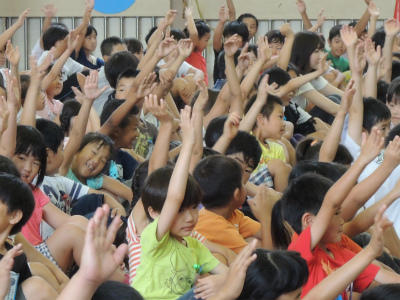 今日は、緑化委員会と集会委員会の発表がありました。「緑を守るんジャー」が登場し、花を大切にしてほしいと伝えました。集会委員会のゲームは、「言葉当てゲーム」といって一斉に言葉を言って考えるゲームでした。