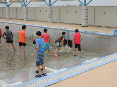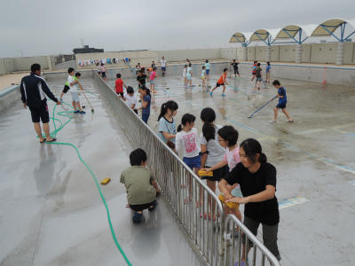 | | 今日は、6年生が6月5日のプール開きに向けて、プール掃除をしました。昨日、放射線測定器を委員会から借りてきて測定したところ、基準を下回る数値でしたので、安心して夕方先生方が今日の準備をしました。 少し肌寒い中でしたが、6年生が1時間ずつきれいにしてくれました。プール開きが楽しみです。 |