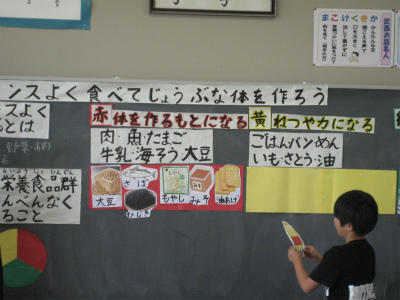 今週一週間本校に教育自習に来ている、栄養教諭の佐藤先生が、4年1組で研究授業をしました。「バランスよく食べて強い体を作ろう!」という学級活動の授業です。昨日の給食の食材を、三色栄養食品郡に分けて、バランスよく食べることの大切さを学びました。