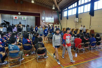今回は、朝方からの暴風雨も下校時にはすっかり晴れましたが、校庭がまだ使えないということで室内で行われました。