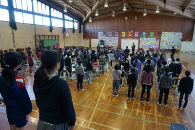 また、今年は一斉下校中ということもあり、国立劇場で行われた政府主催の東日本大震災八周年追悼式に合わせ、校長先生を始めとした代表の教職員で一分間の黙とうを行いました。
