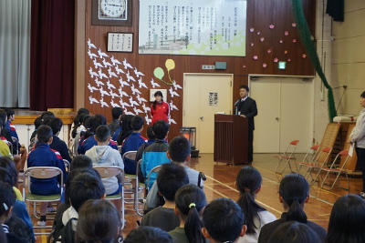 表彰では、体育、図工、国語、家庭科関係で展覧会やコンクール、大会等で優秀な成績を修めた児童やクラスの表彰が行われました。