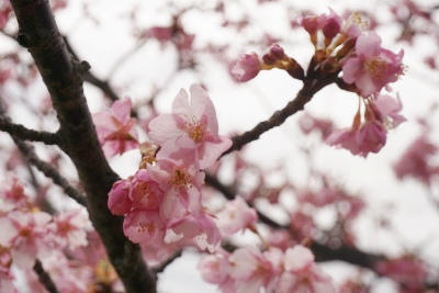 気がつけば、昇降口から校門へと続く道沿いには、川津桜が満開でした。